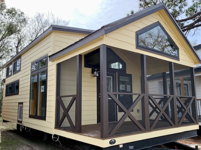 The original wide park model. Wider than the traditional "12 wide" floorplans at 15' wide, this model is a crowd favorite for its uniqueness and versatility. This model will fit a King sized bed in the bedroom with ease, no simple task in most park models. The kitchen and Living room is 1 large great room that is both spacious and very user friendly. This house is equally impressive with or without a loft, and the full width 15' front porch is Amazing! We currently have 2 in stock.