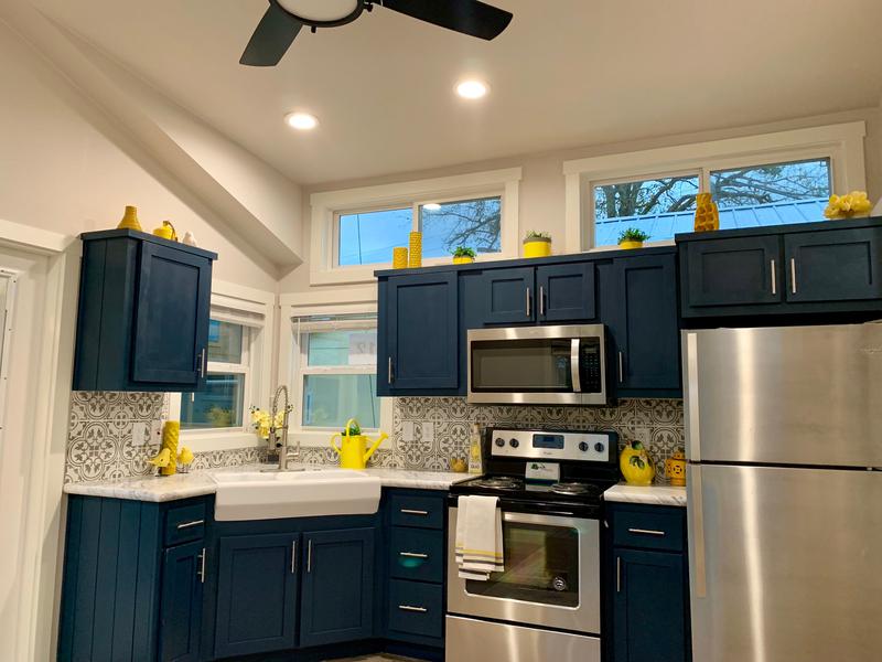 The Premier kitchen with Gale force blue cabinets and a 2 window clerestory window option.