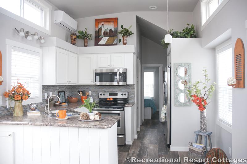 The Stillwater P-571 model by Platinum Cottages and RRC Athens. This floorplan features a huge bar kitchen and lots of storage. Shown with optional Clerestory windows, White Cabs, Stainless appliances and more. Previously on display @ Recreational Resort Cottages Athens Tx.